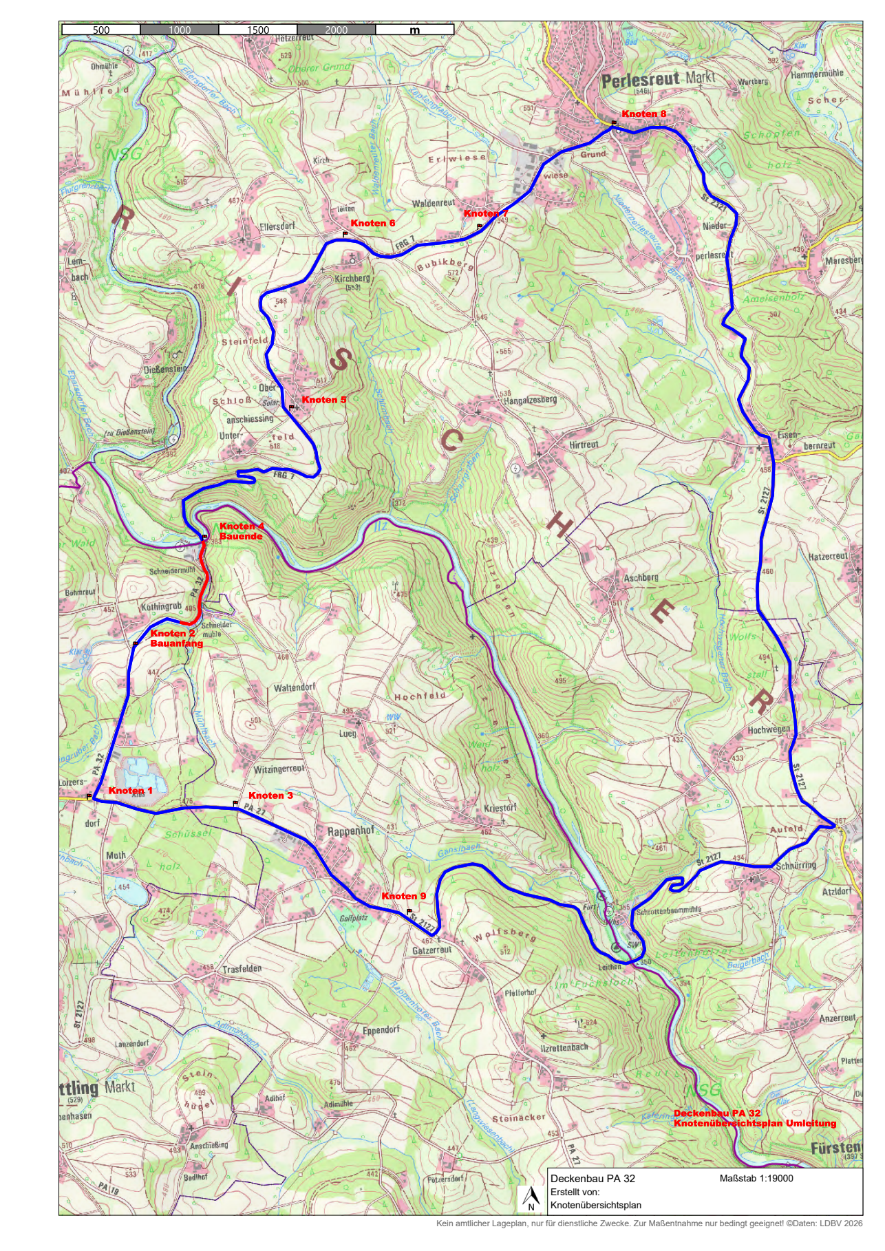 Für die Kreisstraße PA 32 wird der Verkehr über das klassifizierte Straßennetz über folgende Strecke in beiden Richtungen umgeleitet: Kr PA 27 – St 2127– St 2321 – Kr FRG 7.